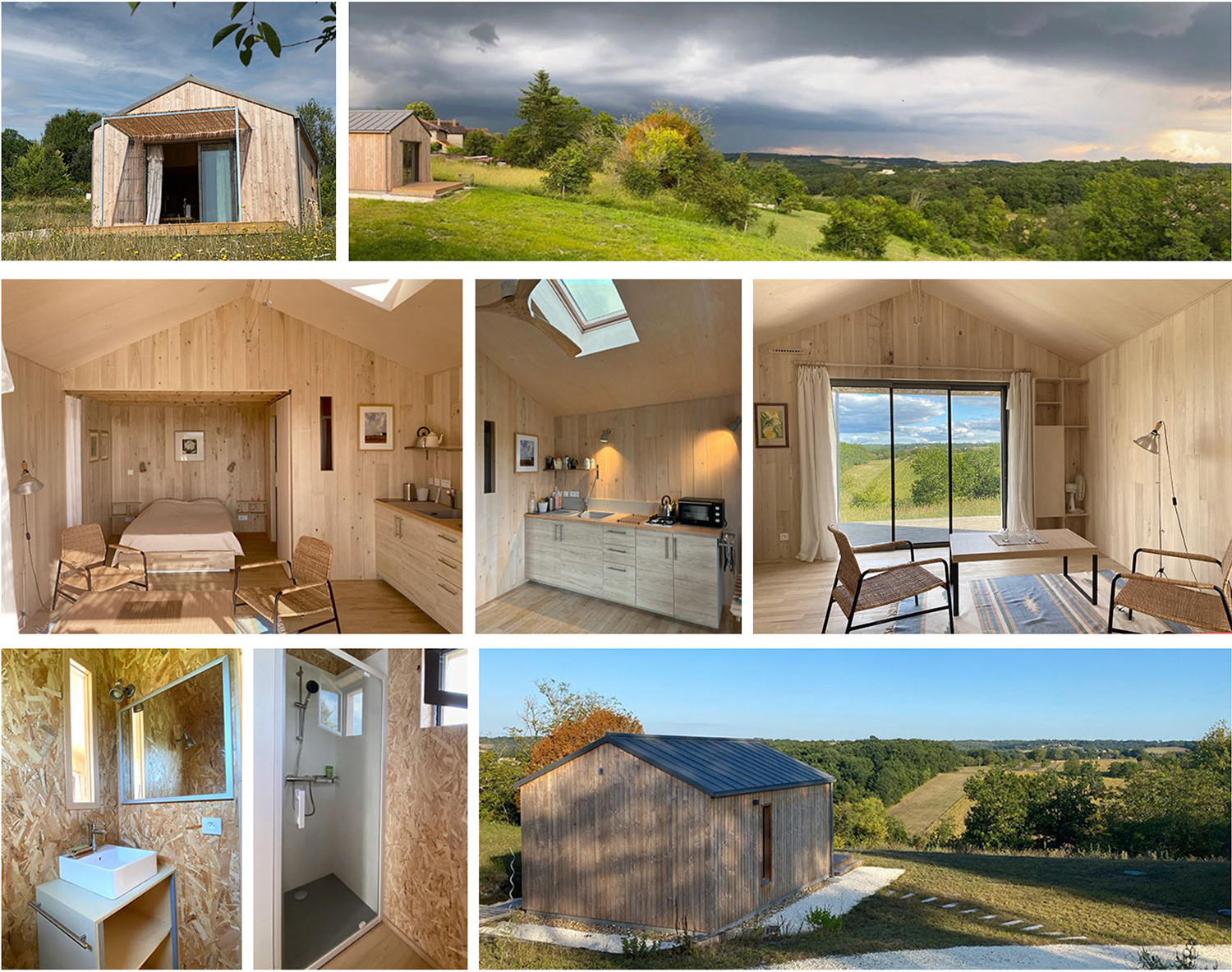 Cabane tout confort, construite avec des matériaux naturels (isolation laine de bois, intérieur peuplier et châtaignier, toit en zinc patiné, électricité photovoltaïque... ), avec une très belle vue sur une vallée du Ribéracois.
